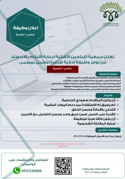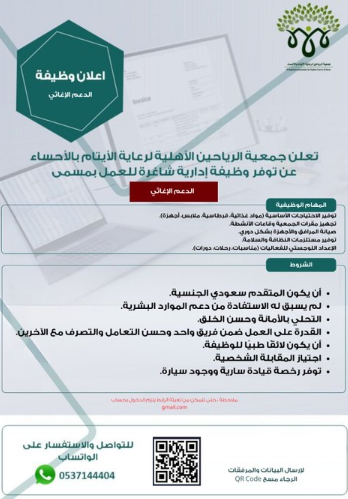 اعلان جمعية الرياحين الأهلية لرعاية الأيتام بالأحساء عن وظيفة الدعم الإغائى
