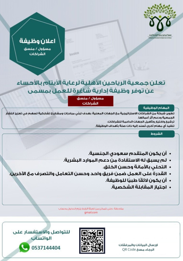 اعلان جمعية الرياحين الأهلية لرعاية الأيتام بالأحساء وظيفة مسؤول / منسق الشراكات